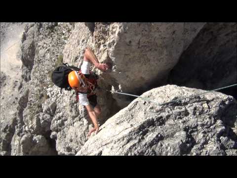 Сассо ди Стрия удивительно популярная гора. А южное ребро — ну просто «Мекка» для паломничества. Пожалуй большая часть моих знакомых, посещавших когда-либо Доломиты с целью полазать — взгромоздились на это легкодоступное и феноменально красивое ребро. Очень элегантное ребро заполировано на ключевых участках до мраморного состояния. Много интересных, техничных участков. Весьма событиен пролаз через пещеру между отколом жандарма и основной стеной. Здесь я рекомендую влазать в дыру пониже — будет проще пролезть. Ключевой участок — нависающий внутренний угол на предпоследней верёвке, вполне обходится по широкому, троечному камину правее. Маршрут идеально подходит для начинающих «доломитистов». Для искателей приключений есть очень авантюрный вариант подхода по военной штольне.